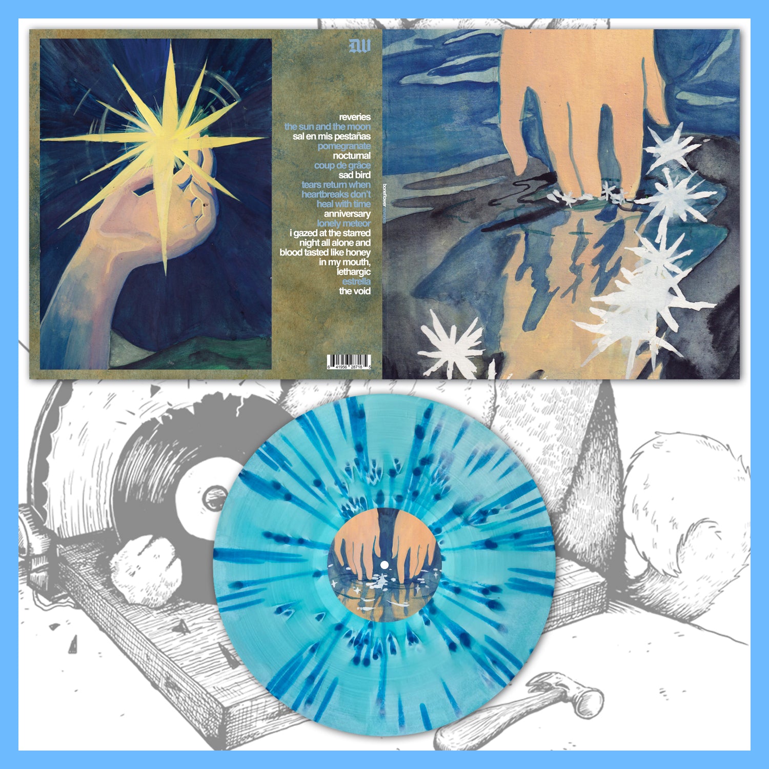 Pressing Info Pale Blue/Bone A/B Swirl w/ Dark Blue & Clear Splatter /296